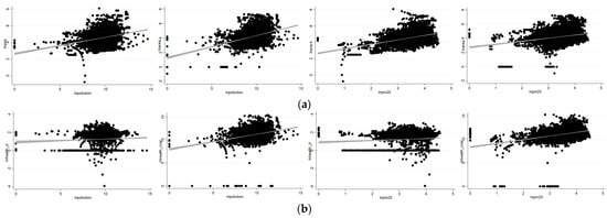 Figure 4a illustrates the positive correlations between environmental pollution and urban scale based on cross-city data (figures in Supplementary Materials Part S2 presenting the related specific patterns of different cities). Moreover, Figure 4b highlights significant positive relationships between pollution and resident health costs, although such associations between pollution and health levels are less pronounced. These data confirm the observed correlations and display some patterns for preliminary analysis. However, it is essential to note that these correlations encompass bidirectional impacts, and thus the findings may differ from those derived from the subsequent causality analysis using cross-city panel data and regression models. In this regard, to obtain more specific conclusions and focused insights into the impacts and mechanisms, this study presents the results of further regression analysis below.