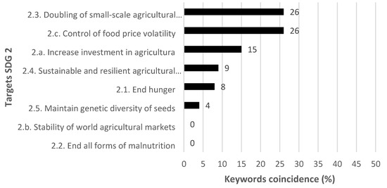 In regard to the incorporation of the policy with the goals of SDG 2, a higher percentage is evident in the increase in productivity and income (target 2.3) linked to export markets (target 2.c). It is weakly aligned with target 2.5 (maintenance of the diversity of seeds), plants, animals, etc., to preserve agrobiodiversity and the traditional knowledge of producers (Figure 2). Productivity guidelines are aimed at promoting sustainable agriculture and developing the capacities of producers through continuous training processes and participatory innovation programs.