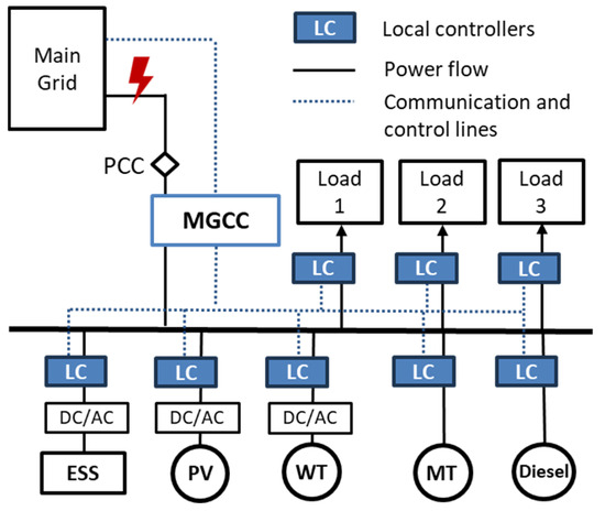 Figure 1 shows the schematic of the test microgrid configuration considered for this study. As previously reported in Section 2, the system is composed of three types of loads, renewable energy sources (one photovoltaic installation and one wind turbine), two controllable generators, and an energy storage system. It must be mentioned that controllable generators refer to dispatchable diesel and microturbine generation units able to modify their production according to the microgrid control center request. The consumption within the microgrid is categorized into three different classes based on the supply reliability requirements. Thus, Load 1 refers to critical consumers who require a high availability of electricity supply; therefore, they will be prioritized in case of emergency. Load 2 refers to preferential consumers, who accept short-term outages, and Load 3 consists of standard (non-critical) consumers, who accept the available reliability level provided by the MG operation conditions. The microgrid is connected to the main power system through the point of common coupling (PCC). However, the remote location of the microgrid—outside the expandable areas of the power network—makes the only line connection to the main grid prone to failures that cause supply interruptions, lasting from a few hours up to several days. During this analysis, prolonged disruptions are considered to occur on the MG’s main grid connection, leaving the microgrid in stand-alone operation mode. Under these circumstances, the energy storage system becomes essential in maintaining the balance between generation and demand. For the proper islanded operation, proper control strategies are required. The MG-associated resources are coordinated by means of local controllers (LC) according to the microgrid central controller (MGCC) commands in order to achieve the power balance within the islanded microgrid. For the integration in the alternating current microgrid of the ESS, PV, and WT, DC/AC converters are used to insure the interface.