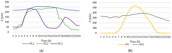 The MG load curves (a) and forecasted PV and WT production (b) for Scenario 2.