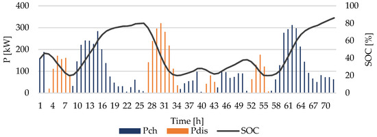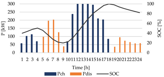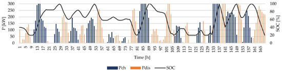 By running the proposed algorithm, the optimal sizing of the ESS needed to ensure maximized load supply for the specified time interval of 1 day resulted to be 601.79 kW rated power. It must be mentioned that for the ESS sizing, a 4:1 ratio of rated energy to rated power was considered. The optimal scheduling of the ESS operation can be observed in Figure 3. It can be observed that charging occurs mostly due to the photovoltaics’ excess generation, while discharge hours are scheduled during the morning (5.00–9.00) and evening peaks (19.00–24.00). However, to be able to cover the morning peak, additional charging takes place during the first hours of the day. To validate the algorithm’s efficiency in terms of optimal resource planning, the scenarios with and without an energy storage system are further compared in Figure 4, where positive values depict the generation and negative values represent the power consumption within the MG.