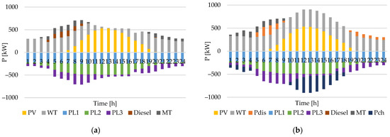 Optimal power dispatch during 24 h resilient operation: (a) without ESS, (b) with ESS.