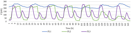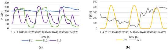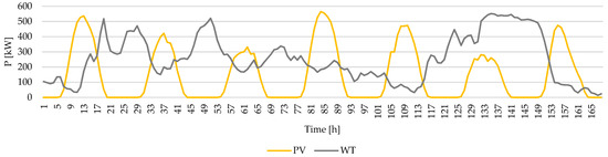 Finally, a 7-day analysis was performed. For this case study, the obtained sizing of the ESS is 584.48 kW. The considered load and RES generation curves are illustrated in Figure 8 and Figure 9. Once again, Load 1 is described by slight variations in consumption, while Loads 2 and 3 feature peaks and valleys in power demand. During the 7 days of the analysis, different production conditions for solar and wind were considered.