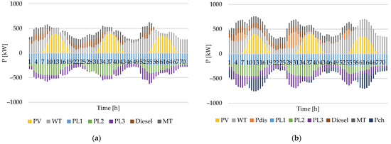 The comparison of the two scenarios reflects a series of problems encountered in the microgrid that are solved in the latter case. First of all, the high production from renewable energy sources that exceeds the total power demand in several time intervals requires for Case a the implementation of curtailment actions between 11.00 and 17.00 to ensure the generation-consumption balance within the microgrid. Also, the high demand during the morning (05.00–09.00) makes it necessary to start the diesel unit to provide the users’ supply. Similarly, during the evening, the diesel generator is used once again to cover the evening peak. However, in the second case (Case b), the cooperation between RES and ESS leads to less production curtailment, which demostrates the efficiency of storage devices in solving the temporary discrepancy problem between generation and consumption. Also, by integrating the ESS, the use of polluting energy production technologies is drastically reduced—especially the diesel generator, which, in this case study, is not started at all.
