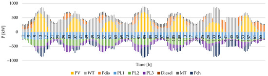 Once again, the scenarios with and without the ESS are compared in Figure 7. It can be easily noted that without the use of ESS, load shedding measures (especially Load 3) are required for several time intervals throughout the 3 days. Also, the operation of the microturbine and the diesel generator is intensified, with multiple hours of operation at maximum capacity. Unlike the previous scenario, due to lower production from RES—even with ESS installation—it is necessary to start up the diesel generator to guarantee the load supply during peak demand.