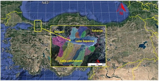 Lake Sapanca extends between the latitudes of 40°41′–40°44′ E and the longitudes of 30°09′–30°20′ N in the northwestern part of Turkey (Figure 1). It is located between two cities: the western part of the lake is in Kocaeli and the eastern end is within the provincial border of Sakarya. It is a 16 km (east–west) and 5 km (north–south) long tectonic fresh water source that provides the drinking water needs of both cities. It has a surface area of 46 km2 and a reasonable depth of 30 m. It has a volume of about 1.3 billion m3. The greatest depth of the lake basin is 54 m, and its catchment area is 250 km2 [36]. The Lake is surrounded by southern mountains and northern hills.