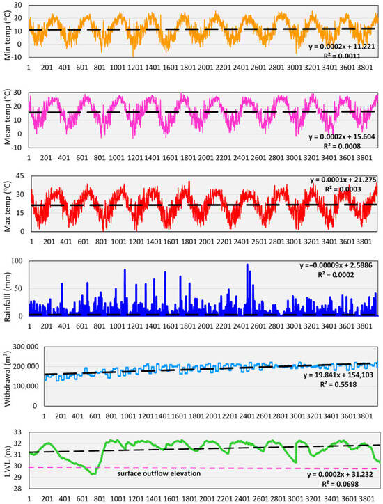 As shown in Figure 2, during prolonged drought, the LWL drops below the discharge elevation at the surface, which is 29.90 m above sea level in Lake Sapanca. Data from LWL indicate that in years of low precipitation, LWL decreases. Higher precipitation in the last decade (2015–2018) coincides with LWLs above the lake’s discharge elevation. In addition, higher maximum temperatures and low precipitation in recent years reduce LWLs to the surface runoff elevation during dry periods (Figure 2). Low precipitation also increases water demand, while low temperatures decrease water use. In addition, increasing population and industrialization are related to water withdrawal from the lake. Therefore, multivariate time series data that include freshwater demand and meteorological characteristics are critical for predicting lake water levels.