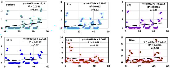 Linear trend of microcystin concentration in the water column at different depths from surface to 20 m from 21 March 2019 to 12 April 2023. (x-axis: data rows in sequence, y-axis: microcystin concentration).