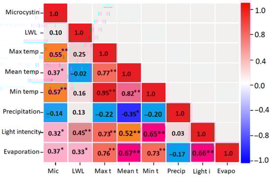 Several well-known nutrient inputs and relatively less known meteorological parameters, together with hydrological disturbances, cause excessive growth of cyanobacteria in freshwater ecosystems, which degrade water quality with their toxins. Extreme heat waves are becoming more common as global and regional warming continues and are expected to become the norm in future scenarios. Microcystin concentration correlated positively with temperature variables (max, min, and mean, p < 0.01), including evaporation and light intensity (p < 0.05), and not significantly with precipitation (negative correlation), which is directly related to LWL (Figure 7). Significant correlations between meteorological parameters and microcystin concentrations in freshwater bodies have been reported previously [7]. Light intensity in the metalimnion zone leads to greater development of cyanobacteria and the presence of large amounts of microcystins, posing potential problems for the use of water resources [62]. Since freshwater lakes are used as drinking water sources, proper water and algae management is necessary to ensure a clean and safe water supply. The use of tap water is restricted when large amounts of algae are found in water reservoirs because various water treatment problems can occur, such as clogged treatment systems, a bad odor, color in the water, and regulated toxic substances such as microcystin. Predicting the correlation of algal blooms with easily measured meteorological or hydrological parameters in advance and taking rapid response actions to algal growth can minimize damage and ensure uninterrupted production of purified water.