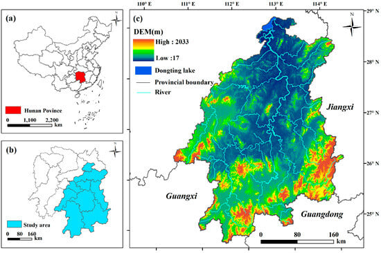 Location map of the XJRB. (a) Hunan province in China. (b) XJRB in Hunan. (c) Topography and river system of the XJRB. The provincial boundary shows other provinces adjacent to the XJRB.