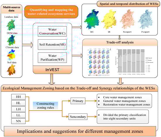 Water-related ecosystem services (WESs) are the water-related goods and services provided by natural ecosystems via the hydrological cycle, which constitute the ecological environment and foundational resources for human welfare [1,2,3]. They refer not only to water from river channels, but also to the activities of water in the terrestrial landscape [4]. Increasing amounts of WESs are needed given the continual growth of the population and the development of society [5,6]. However, water’s ecological functions have been deteriorating due to land use changes. This exacerbates conflicts between the ecological environment and socioeconomic growth, and threatens the ecosystem’s stability and sustainable development [7,8,9]. Therefore, exploring the spatiotemporal changes and relationships among WESs and implementing appropriate land use governance plays a pivotal role in harmonizing the natural ecosystem and socioeconomic development [10].