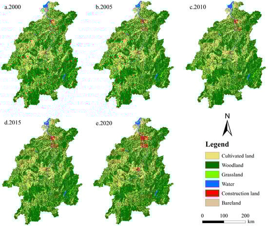 The XJRB is situated in the mountainous area of southern China, where woodland and cultivated land predominate as the primary land use categories (Figure 3). By 2020, woodland covered 61.67%, cultivated land accounted for 29.97%, and other land accounted for 8.36%. Notably, the land utilization types within the watershed underwent noticeable transformations between 2000 and 2020, particularly in the middle and lower reaches. The extent of construction land showed the most remarkable increase, from 1597 km2 in 2000 to 3709 km2 in 2020, with an average annual increase of 105.6 km2. Conversely, cultivated land exhibited a consistently declining pattern, amounting to a cumulative reduction of 1132 km2 over the past two decades. Woodland and grassland gradually decreased, with particularly significant changes between 2015 and 2020, and with most regions converted into cultivated land, grassland, and construction land. In contrast, the extents of water and bare land changed only slightly over the same period.