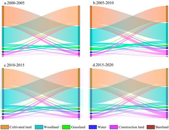 The Sankey diagram above illustrates the transitions in land use between two time periods (Figure 4). The left side of the diagram depicts land use types in the initial year, while the right side represents land use types in the final year. It is evident here that the land use alterations primarily involved cultivated land, woodland, and construction land. The main changes over the entire period concerned the mutual transformations between cultivated land and woodland. Moreover, the primary sources of increased construction land were cultivated land and woodland, with cultivated land contributing to a larger portion of this transformation. Between 2000 and 2005, urban development proceeded at a steady pace. However, starting from 2005, there was a quick spread of construction land, with a particularly notable increase in 2015–2020.