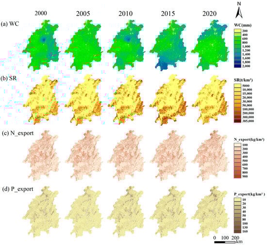 Water purification services remained relatively stable from 2000 to 2020. The change in N export was less than 2%, while P export showed an increase of 5.29%. The quantities of N and P export were between 0 and 850 kg/km2 and 0 and 150 kg/km2, respectively. The high-export regions for N were situated in the central and northern areas, primarily covered by cultivated land. Conversely, regions of lower value were positioned in the eastern and southern regions, predominantly covered by woodland. Notably, urban construction land and cultivated land were high-value areas for P export, whereas woodlands in the upstream area demonstrated the effective interception of both N and P nutrients.
