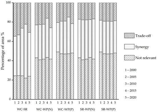 Proportion of trade-offs and synergies during 2000–2020: 1 = 2000; 2 = 2005; 3 = 2010; 4 = 2015; and 5 = 2020. The relationships among WESs include trade-offs, synergies, and those deemed not relevant. WC-SR represents the relationships between WC and SR. Others abbreviations follow the same rule.