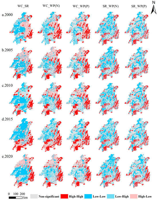 Table 2 shows the bivariate spatial autocorrelation coefficients of WESs in the XJRB. The results indicate that, from 2000 to 2020, WESs in the XJRB showed a synergistic relationship throughout the watershed (Moran’s I > 0, and p < 0.01), with an index of less than 0.35, which is consistent with previous findings [12,52]. Specifically, the synergies between WC and SR gradually increased from 2000 to 2015, reaching the highest value in 2015 (Moran’s I = 0.3237). However, this synergy between the two services was significantly weakened from 2015 to 2020. The synergy between WC and WP (N, P) exhibited a fluctuating pattern—initially declining, followed by an increase, and finally another decline. The lowest degree of synergy was observed in 2010, followed by the strongest synergistic relationship in 2015, and a weaker synergy in 2020. Notably, the SR and the capacity for N and P purification demonstrated a high degree of consistency. The synergistic relationship between SR and WP also showed a fluctuating trend, but it contrasted with the synergy between WC and SR. This trend initially exhibited an increase, followed by a decrease, and then a subsequent increase, with the highest level of synergistic intensity being seen in 2020. The growth of urbanization and the intensive management of cultivated land have contributed to the improvement of regional soil erosion and nutrient discharge, thus strengthening the positive synergy between SR and WP.
