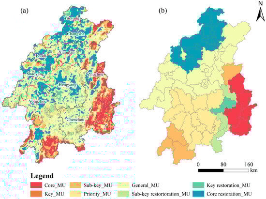 Water ecological management zones were constructed based on the combination rules (Figure 8). The core water ecological management zones had good natural environments and excellent service functions, acting as natural barriers in water ecological protection. The areas of the core management units were 11,865 km2, accounting for 56.8% of this zone (Figure 9). They were mostly found in the southern and southeastern areas of the XJRB, encompassing the central and southern regions of Yongzhou, Zhuzhou, and Chenzhou City. The primary land use categories within this unit were woodland and grassland. Key management units and sub-key management units accounted for 43.2% of this zone. Their spatial pattern closely resembled that of the core units. The area of the general management zones was 48,986 km2, accounting for 48.49% of the total watershed. Among these, the priority management units only accounted for 10.38%. These were located in the transitional zones of woodland and cultivated land, and were mostly concentrated around the core management zones, including the low mountains and hilly areas of Hengyang, Yangzhou, and Chenzhou. The general management units were widely distributed, accounting for 89.62% of this zone. They were generally located in low, hilly areas and cultivated land, with no obvious spatial clustering characteristics. The restoration water ecological zone encompassed 31,155 km2, accounting for 30.8% of the basin. It exhibited extensive distribution across cultivated land, water, and construction land in the western, central, and northern regions of the watershed. The areas of core restoration management units, key restoration units, and sub-key units were 23,047 km2, 4236 km2, and 3872 km2, respectively.