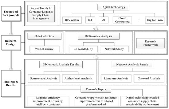 The rest of this paper is structured as follows. Section 2 presents the theoretical background of container logistics supply chain and digital technology. The research methodology and research design are proposed in Section 3, including research data, bibliometric study method, and research framework. Section 4 discloses the research findings and visualization of the collected research samples, and the research themes are summarized. Finally, we end this paper with conclusions.