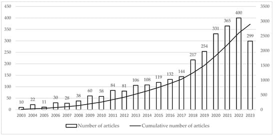 To perform the bibliometric study, the searched references based on expanded keywords were collected to be the data sample. In order to further understand the state-of-the-art of CLSC management, more than 4402 authoritative and high-quality academic papers worldwide were collected in the fields of engineering science, social sciences, arts, and humanities. A total of 2897 research papers published during 2003–2023 were indexed as the review research sample.