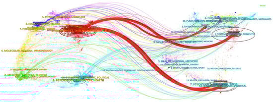 In the figure on the left, the ellipse represents the number of publications corresponding to each journal and shows the ratio of authors to publications, the length of the ellipse represents the number of authors, and the width of the ellipse represents the number of publications (the more papers a journal publishes, the longer the vertical axis of the ellipse; the larger the number of authors, the longer the horizontal axis of the ellipse) [62]. The curves between the left and right parts of the map are citation links, and the trajectory of these links provides an understanding of the interdisciplinary relationships in the field. The z-Scores function highlights stronger, smoother trajectories, with higher scores represented by thicker connecting lines. In this case, publications in Mathematics, Systems, and Mathematical (red track) are influenced by the publications in the following areas: systems, computing, computers (z = 8.64, f = 7052), economic, politics (z = 4.52, f = 3826), psychology, education, and social science (z = 2.1, f = 1936).