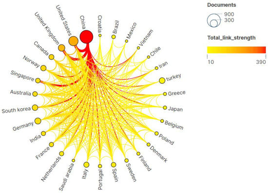 Figure 4 shows the cooperation network map of the top 30 countries in terms of cooperation intensity. It can be seen from Figure 4 that China has the highest cooperation intensity with other countries (the highest cooperation intensity is 390), and it forms the five countries with the highest cooperation intensity with the United States, the United Kingdom, Canada, and Norway. In addition, we observed that China cooperates most closely with the United States, the United Kingdom, and Singapore.