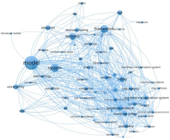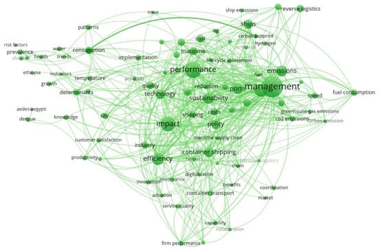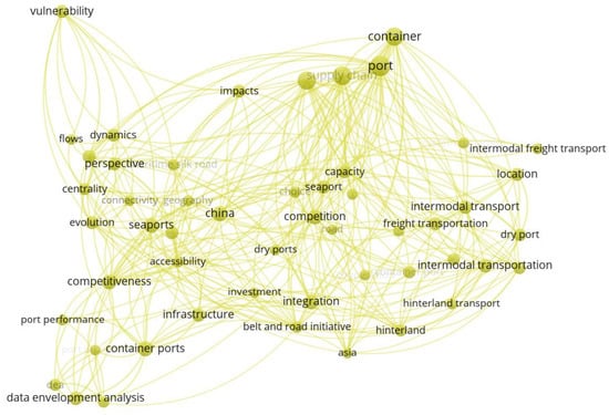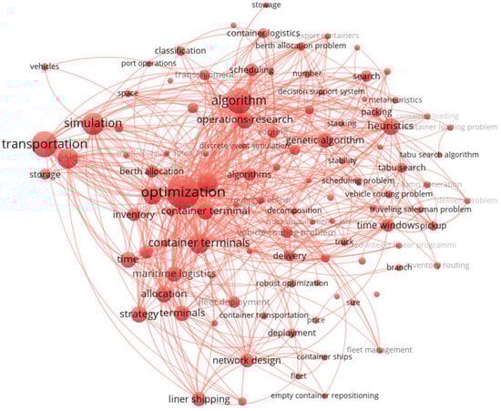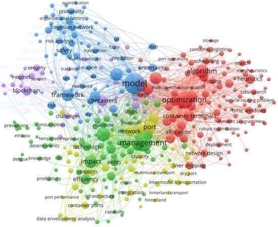 To help better understand the research topic and key words in the container logistics area, a co-word analysis was conducted, which was based on the proposed formula , where represents the number of words with frequency 1, and denotes the minimum frequency value of high frequency words [77]. The VOSViewer software was adopted to extract and analyze the contained keywords of objective references, where a total of 11,093 keywords were found and identified for further investigation. Furthermore, the T-value of this study was calculated to be 26. Therefore, we chose keywords that appeared more than 26 times as the analysis content to ensure the validity of the network graph, as shown in Figure 5.
