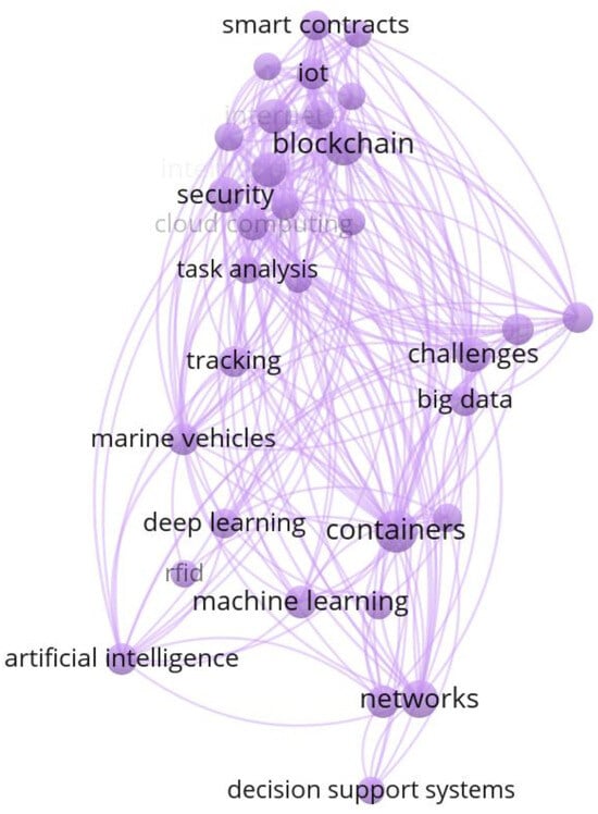 By comparing the co-word analysis focused on research items and keywords, network analysis is another effective research method, concentrating on cooperative interactions between researchers and affiliations in certain research area. Social network analysis was first proposed and applied in psychology research, which is widely used in other fields [59,60]. Regarding its use as an effective data mining tool in the massive literature, a network of keywords, organizations, and nations are categorized and analyzed by exploring the complicated relationships, wherein objective items are presented by nodes. Network analysis can help provide an overall overview of digital technologies and application scenarios. In addition, the co-occurrence analysis on key words with high-frequency in the collected samples could contribute to the discovery of research spots and recent development in container logistics area. The network study could also be performed by the VosViewer software through statistics analysis of the collected references, which probes into insightful ideas for researchers and practitioners from both micro and macro viewpoints.