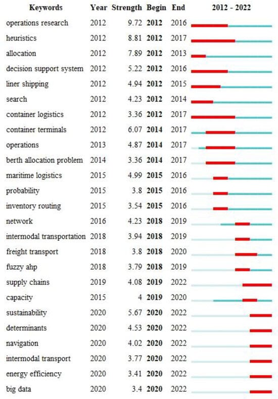 Table 3 lists the 15 most cited papers in the field of container research. Based on highly cited papers, the mainstream research directions were excavated. Among the 15 articles, there were more review articles, including reviews on container terminal operations, berth allocation, transportation operations, etc. However, there is still little literature on digital technologies for container sustainability. Most of the articles were published in Transportation Science and Transportation Research Part C: Emerging Technologies. By classifying the decision-making problems arising in container terminals, an attempt was made to find quantitative models to solve the problems for further research topics.