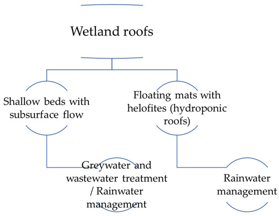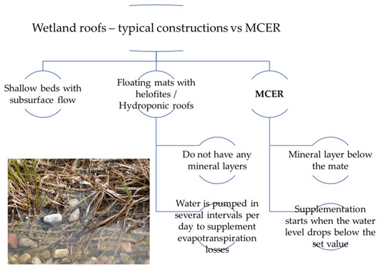 Interest in WRs is growing slowly and there are currently very few examples of their implementation or of related research. There are two main types of WR, shallow beds with subsurface flow and ponds with floating helophyte mates (also called hydroponic roofs, HRs). Shallow beds with subsurface flow are seen in horizontal subsurface flow constructed wetlands (HSF CWs) and are used for wastewater/grey water treatment or rainwater management. HRs contain open water and are thus used only for rainwater management (Figure 1). The weight of a substrate-based WR is comparable to or less than that of an extensive green roof. The total load depends mainly on the designed retention, which is approximately 100 kg m−2 per 10 cm of water layer [11]. As in the case of green roofs, this limits the use of WRs to buildings that have been designed to bear additional loads. Maintenance costs are similar to those of extensive green roofs, but WRs need a sufficient water supply during prolonged periods of drought [12].