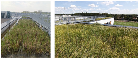 The rainwater management concept assumes that wetlands are supplied by rainwater via precipitation and that surplus water is drained by gravity through underground retention tanks. During dry seasons and rain shortages, the water supply of the wetland comes from the opposite direction, from the tanks to the roof. The water level in the WR can be regulated by roof drains between 10 and 35 cm in size. The present study was conducted on wetland with a unique construction, as the halophyte mats are lying on the bottom, underlined with 10 cm of mineral substrate (Figure 2), rather than floating. The original species composition included Iris pseudacorus, Lythrum salicaria, Caltha palustris, Acorus calamus, Alisma plantago-aquatica, Carex acutiformis, Carex acuta and Carex pseudocyperus. In 2022, when the research was conducted, the roof was dominated by sedges (Figure 3).