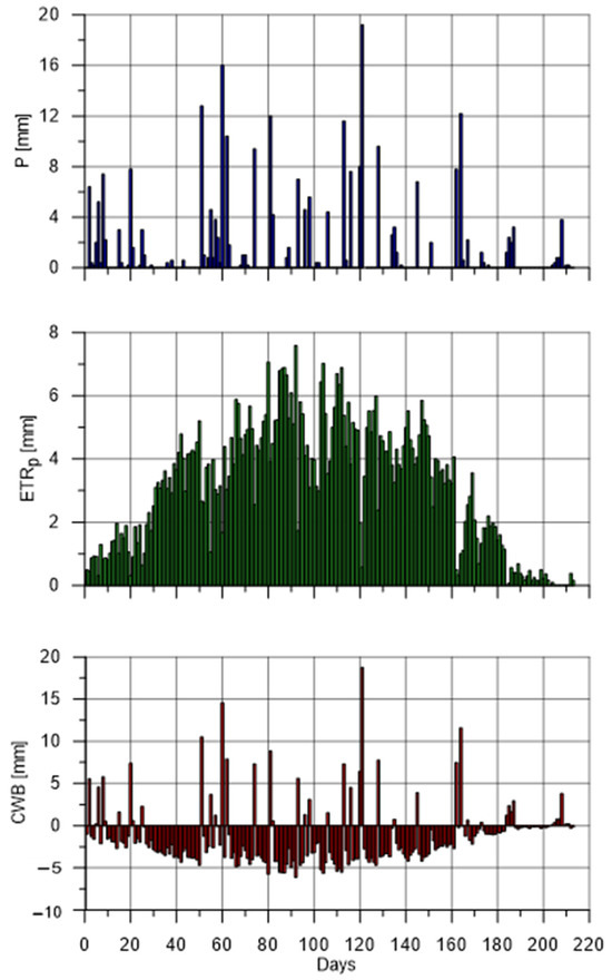 Precipitation (P), potential evapotranspiration (ETp) and climatic water balance (CWB) during the vegetation season, April–September 2022.