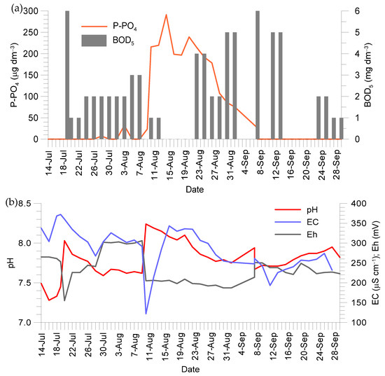 Water quality in the WR, 14 July–30 September 2022: (a) P-PO4 and BOD5, (b) pH, EC and Eh.