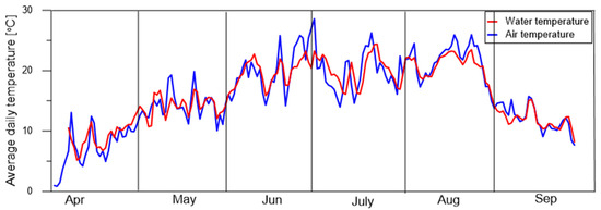 Temperatures during the 2022 growing season at the bottom of the reservoir did not differ vastly from air temperatures (Figure 7). The average air temperature during the season was 15.95 °C, and the average water temperature in the reservoir was 16.28 °C. In the spring period (April–May), the average air and water temperatures were 10.82 °C and 11.95 °C, respectively. In the summer period (June–August), the distribution of mean air temperatures was similar to that of water; the mean water temperature was 20.30 °C, and the mean air temperature was 20.58 °C. In September, the air temperature (12.36 °C) was slightly higher than the water temperature (12.22 °C). It should be noted that, during days with a temperature above 20 °C, the average daily water temperature was lower than the air temperature.