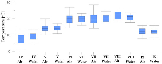 The data from individual months show that, in April, the mean water temperature (9.17 °C, SD = 3.24 °C) was higher than the air temperature (7.36 °C, SD = 2.04 °C) by 1.81 °C (Figure 8). In May, the mean air and water temperatures were similar (14.2 °C). In July, the mean water temperature was 0.3 °C higher than the air temperature, while the standard deviation was lower in water than in air (SD = 2.5 °C and SD = 3.4 °C, respectively). In June, August and September, the mean water temperature was lower than the air temperature, but the differences were no greater than 0.5 °C (Figure 8).