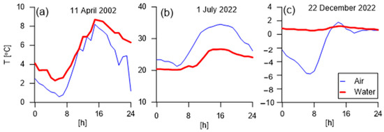 These results allowed for a thorough analysis of daily temperature changes in spring and summer, and also on winter days, which are outside the observation period reported in this study. On an example spring day (11 April 2022), at night and in the morning, the air temperature was lower than the water temperature by approximately 2 °C, while in the afternoon, the temperatures were similar (Figure 9a). On the hottest day during the measurement period (1 July), the air temperature increased with the increase in active radiation (the average daily temperature was 28.5 °C), while the water temperature was 5.2 °C lower than the air temperature (Figure 9b). These results indicate that the vegetation and the water bodies were both contributing to cooling and humidifying (Figure 9b). However, on a winter day (22 December 2022; outside the study period), the average temperature difference between the air and water in the reservoir was 2.5 °C (Figure 9c). A greater variation in temperature was recorded for the air temperature (SD = 2.6 °C) than for the water temperature (SD = 0.17 °C). When the air temperature dropped below −5 °C, the water temperature was 0.3–1.5 °C.