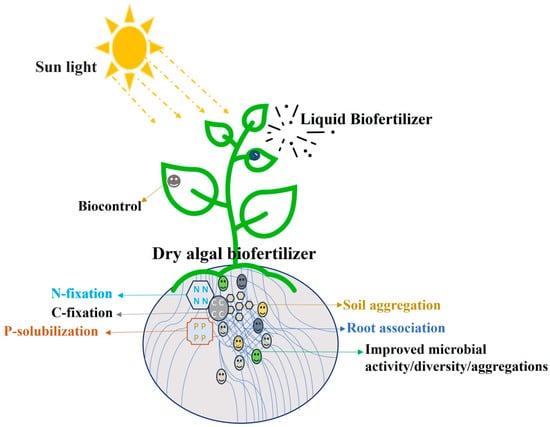 - Das, P.; Khan, S.; Chaudhary, A.K.; AbdulQuadir, M.; Thaher, M.I.; Al-Jabri, H. Potential Applications of Algae-Based Bio-fertilizer. In Biofertilizers for Sustainable Agriculture and Environment; Giri, B., Prasad, R., Wu, Q.-S., Varma, A., Eds.; Springer International Publishing: Cham, Switzerland, 2019; pp. 41–65. ISBN 978-3-030-18933-4. [Google Scholar]