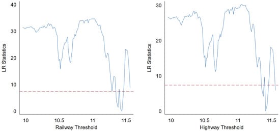 Table 9 exhibits the test results of the threshold effect. The model passed the single threshold test, and the threshold values of railways and roads were similar. All the above results were obtained after 500 times repeated sampling by Bootstrap.