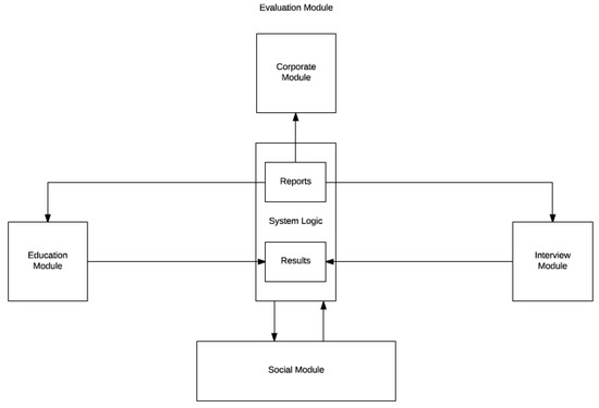 The system consists of a total of six modules: a business module, training module, interview module, social module, pricing, and evaluation modules.