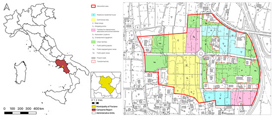 With a view to exemplify the proposed procedure, different planning scenarios varying in the quality, quantity, and distribution of green materials have been simulated on an area in the municipality of Fisciano, which is a small town in the province of Salerno in Southern Italy (Figure 1). The area of 245,166 m2 is bordered to the south and east by highways and to the north and west by municipal roads. It is mostly surrounded by residential, industrial, and agricultural sites, including a service area pertaining to the University of Salerno. Excluding roads, it is possible to identify 18 lots with different destinations: residential, commercial, social spaces, and urban facilities, with the latter including green areas (Figure 1 and Table 3).