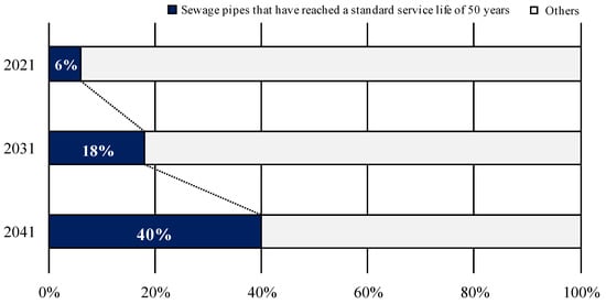 Currently, the sewage system’s penetration rate in Japan is approximately 80.1% [1], as of the financial year 2020 (FY2020), and the total length of sewage pipes is approximately 490,000 km as of FY2020, with a massive infrastructure stock present. Moreover, as of the financial year 2021 (FY2021), the total length of sewage pipes that have reached a standard service life of 50 years is approximately 30,000 km (approximately 6% of the total length), which will rapidly increase to approximately 90,000 km (18%) in 10 years and approximately 200,000 km (40%) in 20 years (Figure 1) [2]. The causes of this deterioration include, but are not limited to, time-dependent factors owing to the environments in which sewage pipes are required to function; for example, they are exposed to traffic loads and the microbial corrosion of concrete, and their aging progression is faster than that of other structures. Furthermore, in 2020, the aging of sewage pipes caused 2700 road subsidence accidents, and this aging can thus cause serious social problems [2]. Preventing such situations requires the appropriate implementation of inspection and repair. Sewage pipe inspection is currently conducted via visual and video-camera surveys; however, the total length of pipes surveyed in FY2018 via visual and video-camera inspections combined was only 6686 km (1.4% of the total length [3]), and at this pace, 72 years would be required to survey the entire sewage pipe network once, which does not allow for appropriate maintenance and management. Moreover, Japan has faced shortages in financial resources, human resources, and technology owing to the financial difficulties of local governments, its declining birthrate, and its aging population. It is therefore difficult to perform a comprehensive survey of such a large number of sewage pipes.