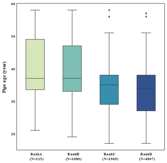 Figure 3 presents a boxplot of the soundness and age of sewage pipes in City A. Details of the soundness index are described in Section 3 of this paper, but the evaluation is conducted using four ranks, from Rank A, with the lowest soundness, to Rank D, with the highest soundness, where NA represents the amount of data belonging to Rank A, and the amount of data belonging to Ranks B, C, and D is similarly expressed as NB, NC, and ND, respectively. Figure 3 shows that Ranks C and D, which comprise relatively high soundness, tend to have a younger pipe age compared to those in the case of Ranks A and B. However, there are pipes even among Ranks A and B that have a low age, and it can be confirmed that there are many overlapping pipes in the interquartile range. These results indicate that, when using only the pipe age to evaluate the soundness of sewage pipes, an appropriate evaluation cannot be conducted for old pipes with high soundness and young pipes with low soundness, and it is difficult to screen locations needed for inspection efficiently. Therefore, when evaluating the soundness of pipes, there is a high possibility that an inaccurate result would be obtained by using only the pipe age, and such evaluations should thus be conducted while taking into consideration various factors that decrease the soundness of pipes.