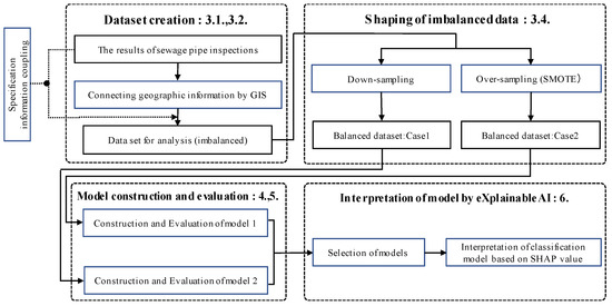 Figure 4 presents the analysis procedure in this study. In this study, we built and evaluated a machine-learning model using the results of sewage pipe inspections conducted in City A. We used positional information recorded in the inspection results to acquire information regarding the underground pipeline environment. We built a machine-learning model for the purposes of estimating the soundness of sewage pipes using acquired information from the buried environment and the pipeline specification information recorded in the inspection results. In this study, we built two types of machine learning model using different data, depending on the shaping method of the training data that were used for the model training. Machine learning models have a high predictive performance, but the predictive basis of the models is not clear. When using machine learning to estimate the soundness of infrastructure structures, it is important to be clear about the basis on which the predictions have been made. In recent years, there has been a lot of research on Explainable AI (XAI) to reduce the predictive uncertainty in machine learning models. In this study, the machine learning model is interpreted using SHAP (Shapley additive explanations) [6], one of the XAI methods, to examine the influence of sewage pipe specifications and the buried environment (e.g., pipe age, and pipe length) on the prediction of the machine learning model. The model also extracts the deterioration factors. As mentioned in the previous section, the current maintenance and management guidelines [4] list only pipe age as a deterioration factor to be focused on in the maintenance and management of sewage pipes. The deterioration factors extracted in a data-driven manner using the XAI method in this study are expected to provide useful knowledge for the future maintenance and management of sewage pipes.