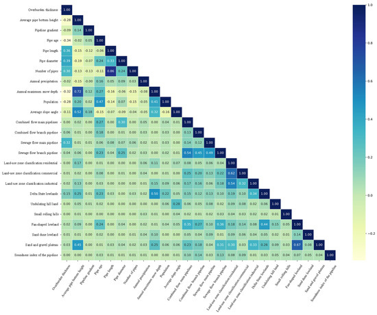 Regarding overburden thickness, Khan et al. [45] showed that an increase in depth in a pipe has a negative effect on the condition level of the sewage pipes. In this study, it was found that the higher the overburden thickness, the higher the contribution to the Rank A classification. This agrees with previous studies [45]. This may be due to the fact that the greater the soil cover thickness, the greater the deadload on the pipe and the higher the probability of meeting groundwater. In this study, the groundwater level has not been directly considered. However, when focusing on the average pipe bottom height and average slope angle, the average slope angle was small, and the pipes located at lower elevations had a higher contribution to the Rank A classification. It is considered that groundwater flows into areas with small average slope angles and low elevations, and that these areas are likely to have high groundwater levels. The above results suggest that the average pipe bottom height and the average slope angle in the pipeline represent the groundwater level.