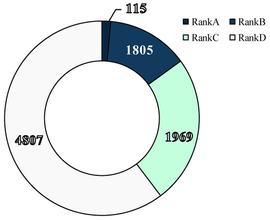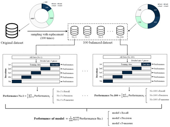 Figure 6 presents the breakdown of the data used in this study. A very small amount of the data used in this study belonged to Rank A, with low soundness, and there is a large bias in the amount of data. When building a machine learning model, the use of imbalanced data in the training process can increase the apparent accuracy of the classification into classes with a large amount of data, and there exists the concern that the training should be optimized and its accuracy should be improved for classes with a large amount of data instead of learning important features in the classification. Therefore, in this study, we applied down-sampling and over-sampling to the imbalanced data to create a balanced dataset. First, for down-sampling, the amount of data belonging to Rank A, which is the class comprising a smaller amount of data, was adjusted to the amount of data of the other classes. Specifically, random sampling was conducted for the amount of data belonging to Rank A (115 cases) from classes other than Rank A. At this time, there may be biases in the dataset depending on the sampling method. Therefore, in this study, the model building and evaluation processes were conducted based on a dataset generated by means of multiple random sampling. The details of the model building and evaluation processes are described below. In this study, random sampling was conducted 100 times to create 100 balanced datasets with the same amount of data in each class.