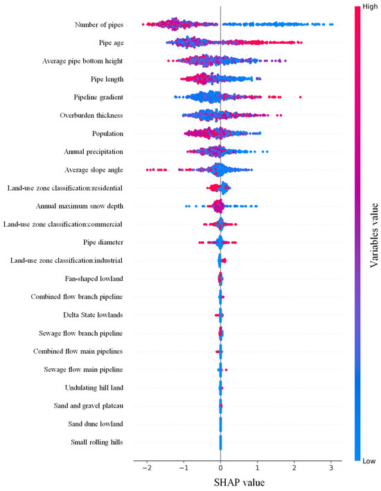 Regarding the pipe diameter, Ariaratnam et al. [9] and Jeong et al. [47] mentioned that the risk of deterioration is higher for pipelines with larger diameters. On the other hand, Micevski et al. [48] and Tran et al. [49] mentioned that the rate of deterioration is lower for pipelines with larger diameters. In this study, there was no clear relationship between SHAP values and pipe diameter, and the effect of pipe diameter on the deterioration of sewage pipes could not be determined.