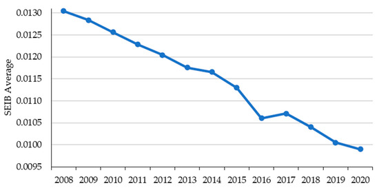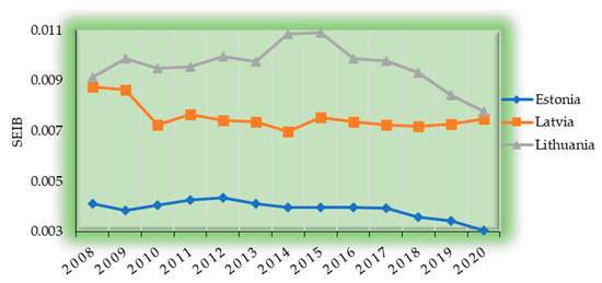 The SEIB results make us understand even better the clusters that these countries in the region form. We first look at the results from the perspective of the regional average (Figure 4). What we notice first of all is that the average SEIB has an obvious downward trend during recent years. This trend can be based on several reasons, such as the persistent effects of the 2008 crisis, but also the transition to a bio-based economy. We note that, despite the scale that the bioeconomy has reached in recent years, the SEIB has lost a little over a percentage point in a 12-year interval, decreasing to below 0.01 in 2020.
