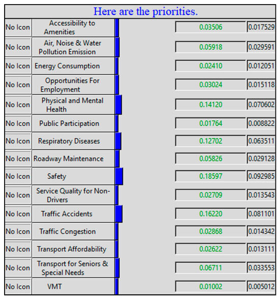 One of the standout findings is the unequivocal priority assigned to safety by our panel of experts. This underscores the universal concern for road user safety and highlights the pivotal role of safety measures in transport planning. The studies conducted by Alonso et al. [71] and Haghshenas and Vaziri [24] suggest that safety-related metrics are the most commonly observed indicators in the existing literature. This finding corroborates the findings of other studies in different parts of the world, such as European countries [72], India [73], Nigeria [74], and Egypt [75]. The fact that safety emerged as the top priority aligns with the broader goals of social equity and sustainability. Reducing accidents, injuries, and fatalities not only safeguards individuals’ well-being but also contributes to the overall sustainability of the transportation system.