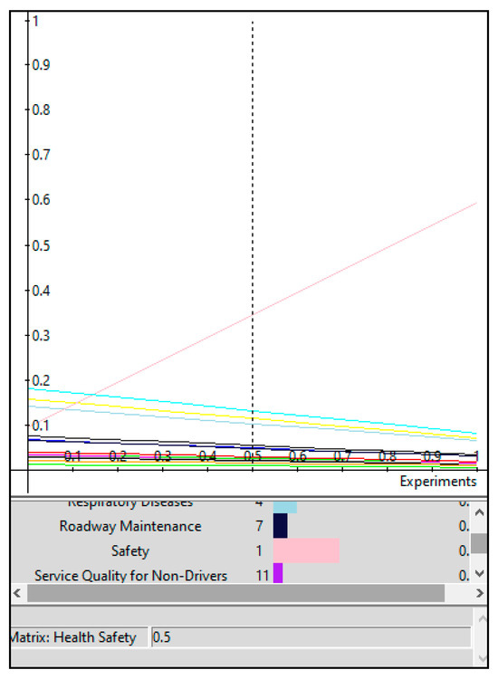When employing ANP, conducting a sensitivity analysis is crucial, as it helps assess the model’s stability concerning variations in judgments [60]. This analysis evaluates how changes in an independent variable’s values impact a specific dependent variable, all within a defined set of assumptions [63]. To ensure the stability of the outcome of the analysis in this research, a sensitivity analysis was performed to assess the robustness of the ANP model by varying the weights assigned to the criteria. Through the sensitivity analysis, it was determined that when altering the weights did not result in significant changes in the output results, the model demonstrated stability [27]. Figure 9 illustrates the current weight of the determinant with a dashed vertical line in black. The figure explains that even when the weights of the criteria were changed (the location of the vertical black line), the ranking of the indicators and the highest priority were still the same (i.e., the safety indictor was always the first priority). In other words, the results indicated a high level of stability, with no significant changes in the overall rankings.