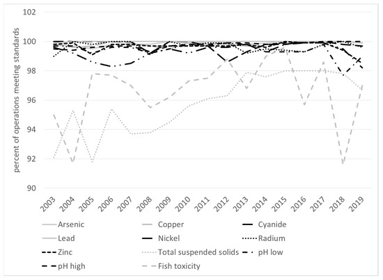 As seen in Figure 1, since the introduction of effluent quality regulations, the percentage of mining operations that meet water quality standards has been above 98% in the cases of arsenic, copper, cyanide, lead, nickel, radium, and zinc concentrations, and pH levels. Meeting fish toxicity and total suspended solids limits was more difficult as the share of compliant operations was between 92% and 98% in most years.
