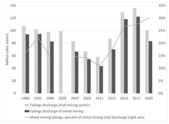 What do our results imply for each mining sector? Our study has found evidence of a positive impact of effluent quality regulation on metal mining. Using sectoral data, we found that metal mining companies decreased both water intake and discharge at higher rates than before the introduction of regulations. We were able to confirm statistically the finding of the positive impact of regulations on water discharge using regional data analysis. Let us consider other potential reasons for the observed change. Falling water use intensity in metal mining may be related to the effect of effluent quality regulations (i) or the changing composition of metal mining output towards less water intensive products (ii). Let us evaluate the latter hypothesis. During the last decade, the top two products of metal mining were iron ore and gold. They experienced significant increases in output volume (by 65% and 78%, respectively). Although gold mining is characterized by higher water use intensity compared with iron ore mining (0.745 cubic meters per ton (CM/t) vs. 0.588 CM/t, see [32]), differences in output volumes (1000 tons vs. 36.5 million tons, see Table 1 above) make changes in the composition of metal mining output an unlikely explanation for decreasing water use intensity in metal mining. This provides support for our first hypothesis that discharge quality regulations were the key driver behind falling water use intensity of Canadian metal mining operations. Regarding water quality impacts, we find that most metal mining companies met discharge standards, although requirements for suspended solids and fish toxicity were more challenging to achieve. Another issue of concern that requires further research is increasing flows of discharge to tailings ponds and a growing share of tailings in the total discharge of metal mining firms. This development is undesirable as tailings present complex sustainability risks [33].